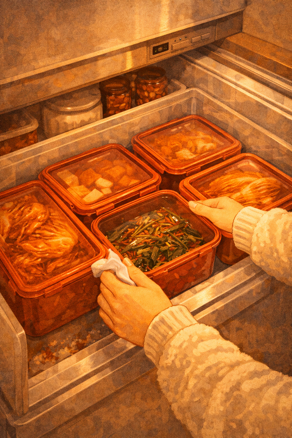 “서랍식 김치냉장고를 열고 용기들을 조심스럽게 꺼내는 모습”